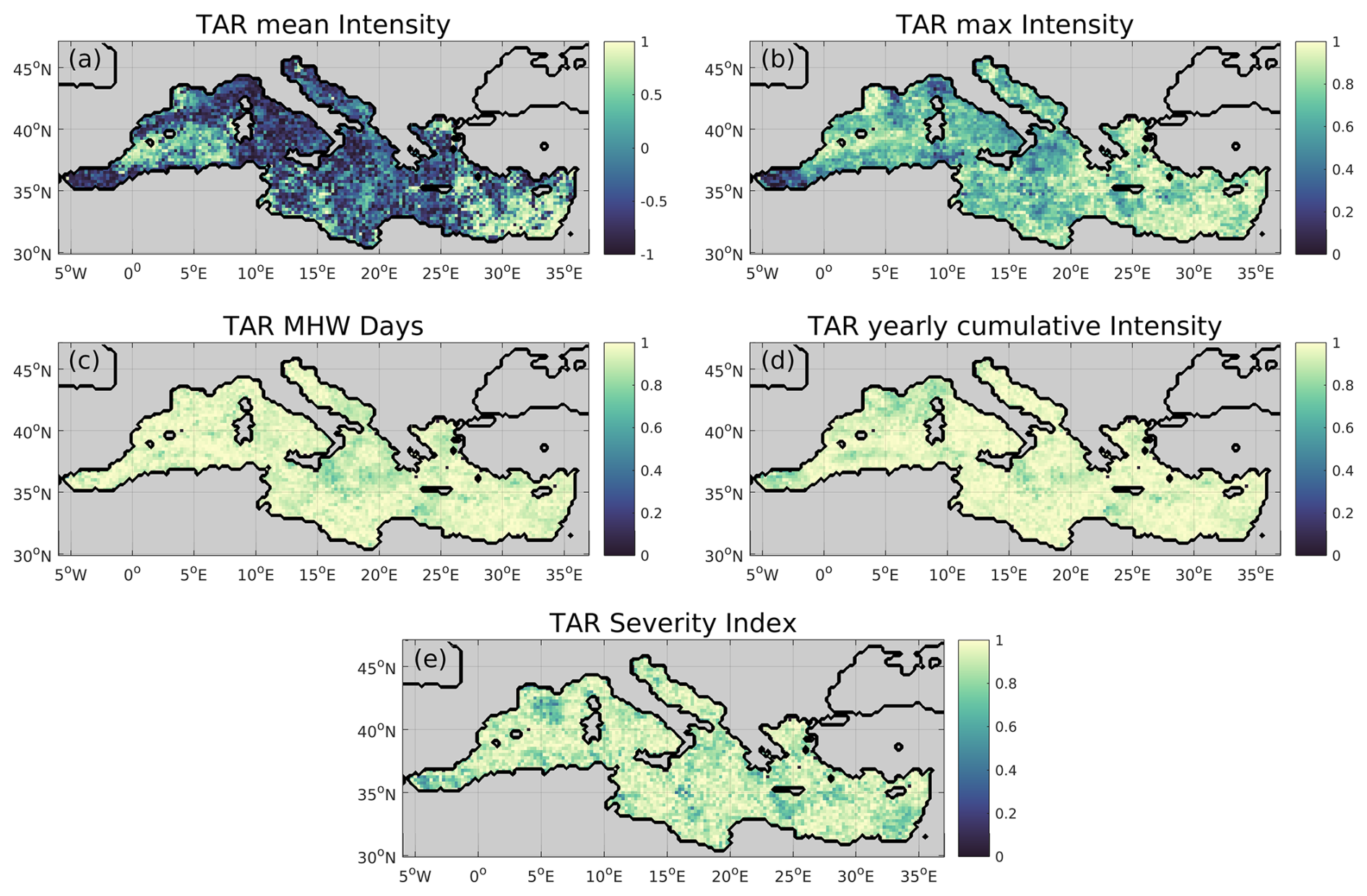 For the rest of the examined MHW properties' trends, positive TAR values across the entire basin indicate a dominant role of mean SST warming in driving their increase during 1982–2023 (Fig. 3b–e). We note here that, the greater the value of TAR, the stronger the impact of the mean SST warming. Positive TAR values for the maximum MHW intensity shown in Fig. 3b range from 0 to 1 across the basin, revealing areas with a marginally stronger influence of the mean SST warming signal compared to that of the interannual SST variability (Alboran Sea, followed by the Ligurian Sea). However, there seems to be a clear prevalence of the mean SST warming especially over the eastern basin for this metric (Fig. 3b). Spatial distribution of TAR for the maximum severity index exceeds 0.6 in most of the basin, indicating a basin-wide dependence of this metric on the mean SST warming (Fig. 3e). Furthermore, high positive TAR values are seen for the number of MHW days and the yearly cumulative intensity, exceeding 0.8 throughout the basin (Fig. 3c, d).