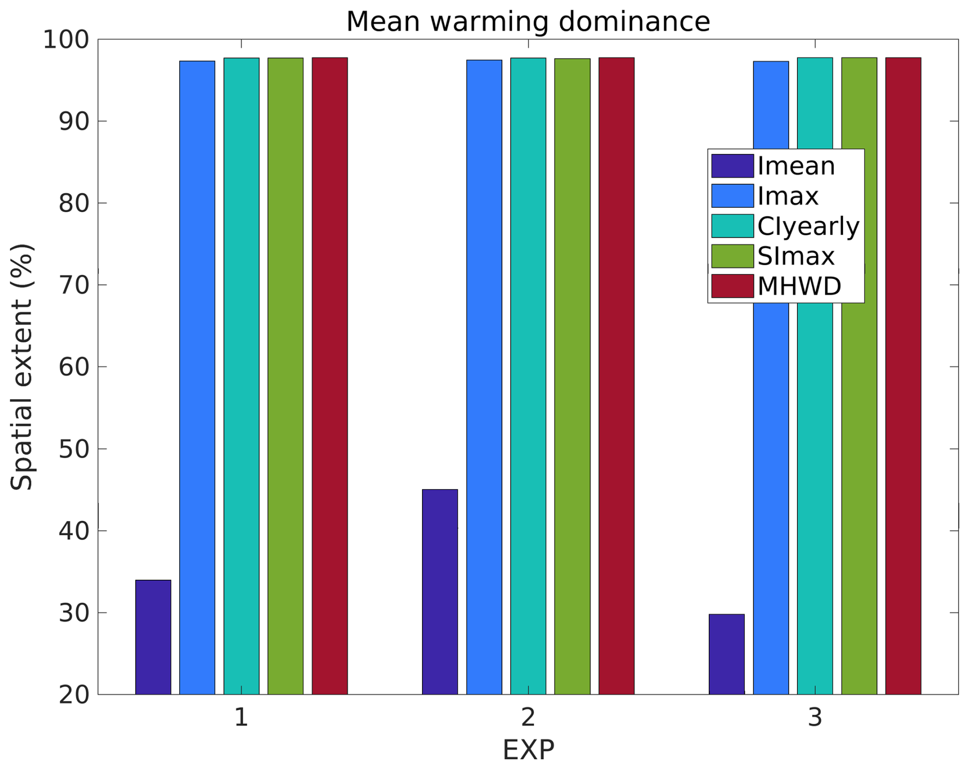 Figure 4Sensitivity of the trend attributional ratio (TAR) to different approaches for base climatology used in MHW detection in the original (non-detrended) dataset. Vertical axis: percentage of Mediterranean locations with positive TAR (i.e., mean warming dominance in trends in MHW metrics). Horizontal axis: EXP1 – climatology computed based on the detrended dataset with reference period 1982–2023; EXP2 – climatology computed based on the non-detrended dataset with reference period 1982–2023; EXP3 – as EXP2 but with reference period 1982–2002. Metrics used: mean intensity (Imean), maximum intensity (Imax), number of MHW days (MHWD), yearly cumulative intensity (CIyearly), and maximum severity index (SImax). Product used: Mediterranean Sea High Resolution L4 Sea Surface Temperature Reprocessed (Table 1, product ref. no. 1).
