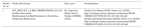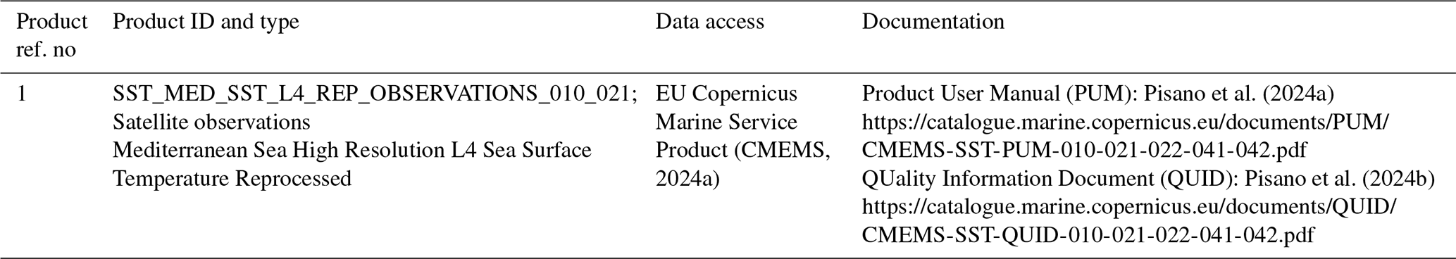 Pisano, A., Fanelli, C., Cesarini, C., Tronconi, C., La Padula, F., and Buongiorno Nardelli, B.: EU Copernicus Marine Service Quality Information Document for the Mediterranean Sea – High Resolution L4 Sea Surface Temperature Reprocessed Product, SST_MED_SST_L4_REP_OBSERVATIONS_010_021, Issue 4.0, Mercator Ocean International, https://catalogue.marine.copernicus.eu/documents/QUID/CMEMS-SST-QUID-010-021-022-041-042.pdf (last access: 14 May 2025), 2024b.