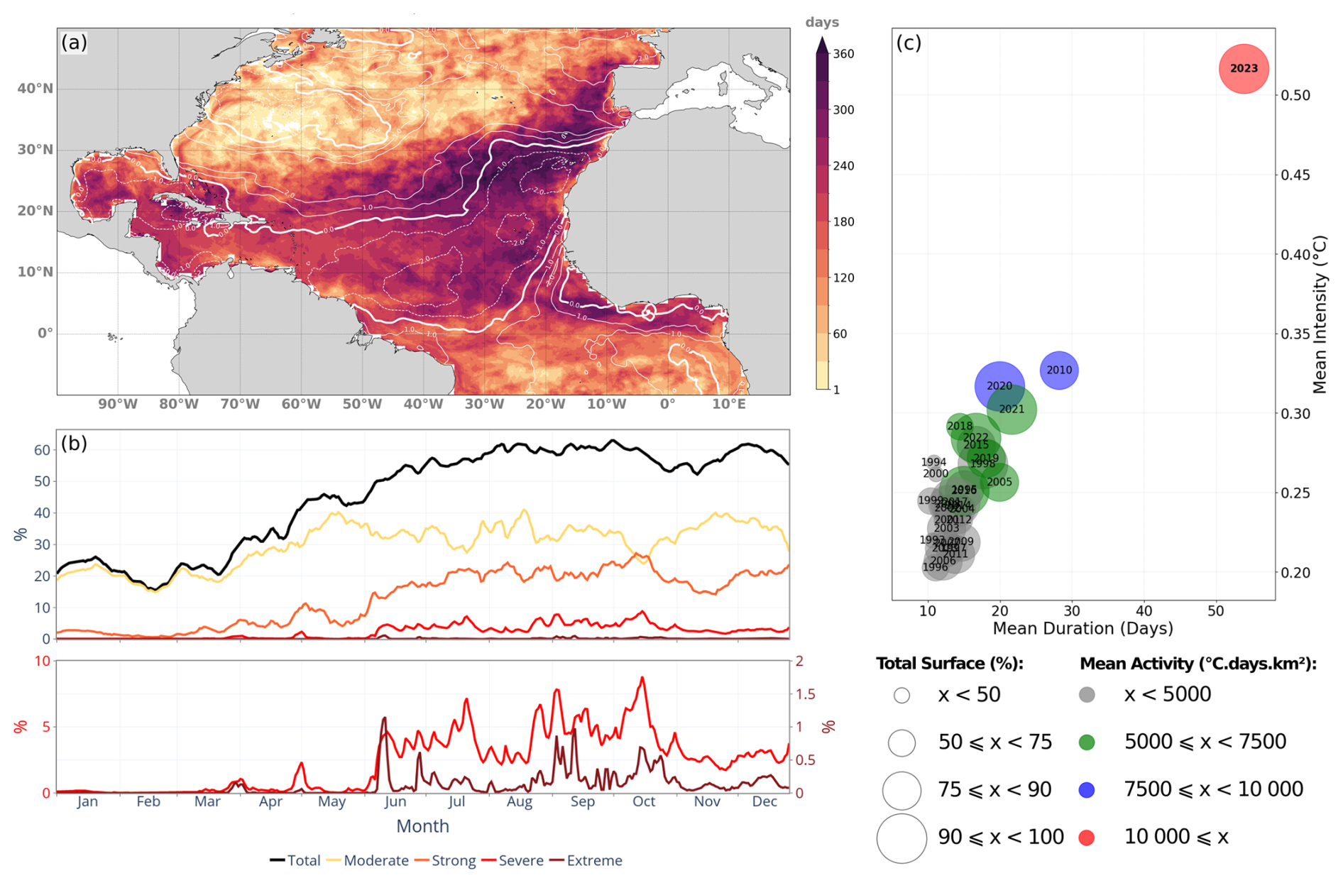 Figure 1Characteristics of the marine heatwave hitting the North Atlantic across 2023 between 10° S and 50° N: total number of heatwave days (a); evolution of the total area and area by category affected by MHW events (b); and representation of the MHW event for 2023 in terms of mean duration, intensity, maximum coverage (bubble size) and activity (coloured bubble) relative to previous years (c). White contours in panel (a) refers to the annual mean of absolute wind anomaly (m s−1).