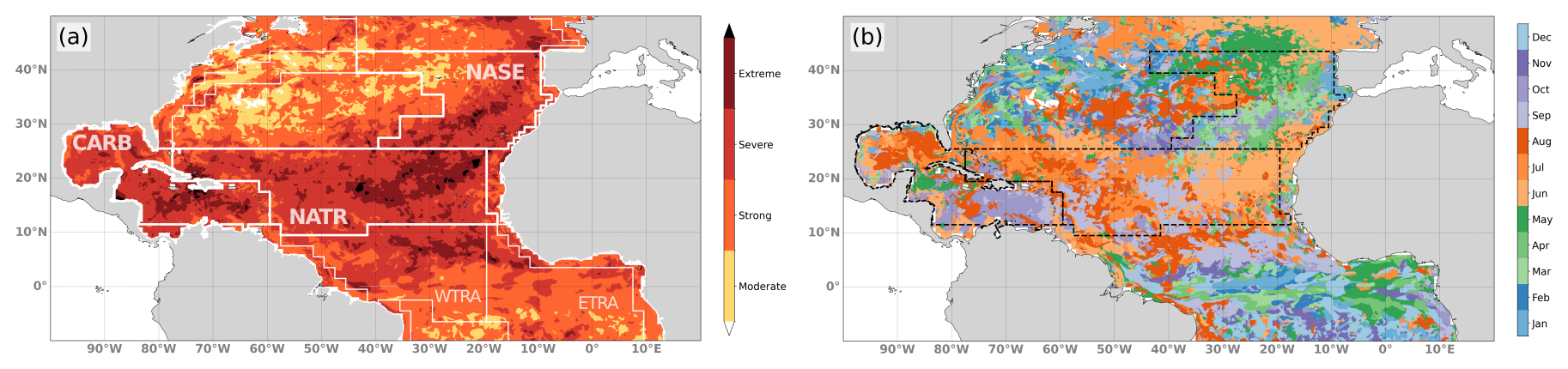 Figure 2Highest marine heatwave category reached in 2023 (a) and month during which the highest category first occurred (b). Zones delimited in white in panel (a) and black in panel (b) refer to the Longhurst biogeochemical provinces.
