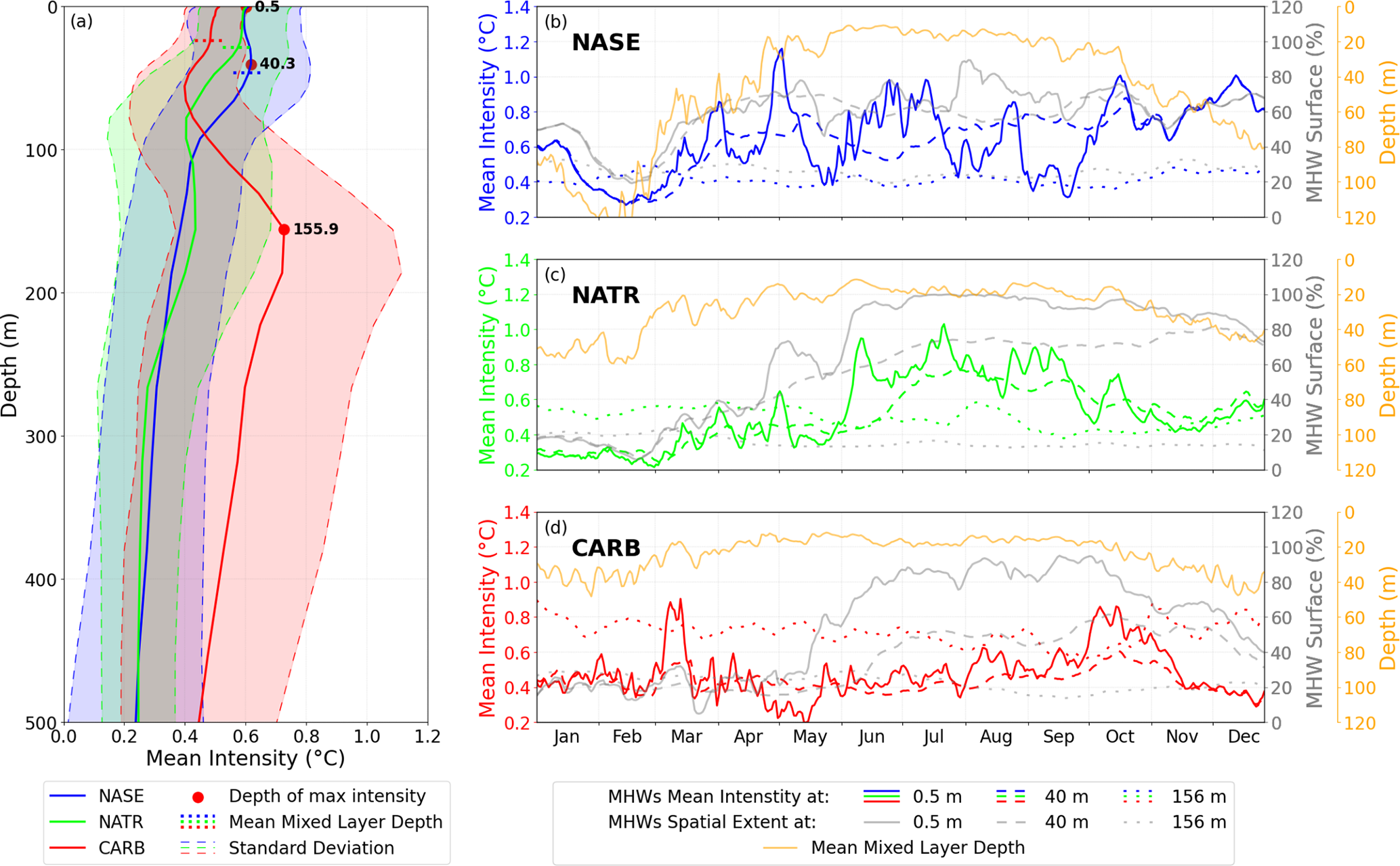 The depth profile of MHW intensity is not identical across the basin, with significant differences across the region, most notably for the depth where the maximum intensity occurred (Fig. 3a). Intensity peaks at much deeper depth in the CARB region (max at 156 m, deeper than the mean MLD of 23.8 m represented by red dotted horizontal line) than for NASE and NATR regions. For NASE and NATR regions, maxima occur at 40 m and close to the surface, respectively, both within the mixed layer (MLD represented by blue and green dotted horizontal lines). The mean intensity profile of MHWs for NASE shows homogeneous levels across the mixed layer with slightly higher values at subsurface (40.3 m depth), at the bottom of the mixed layer. The NATR region shows a different MHW intensity profile than the NASE region, with a maximum in the surface layer. In addition, we notice from the standard deviation of the MHW intensity (shaded area) that spatial inhomogeneity is largest for the CARB region for depths between 150 and 400 m.