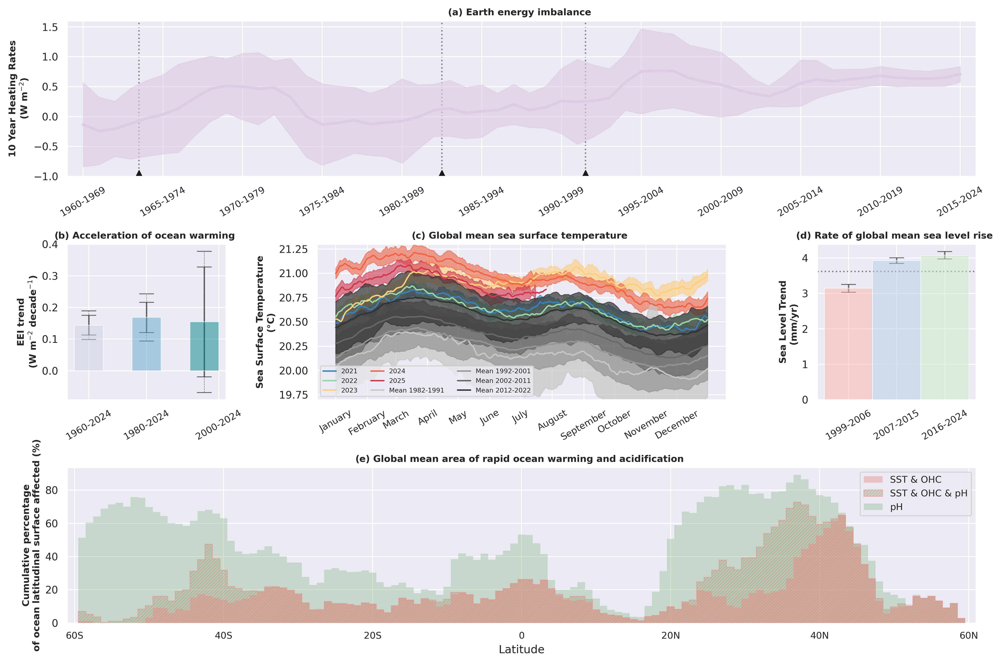 Figure 1Ocean change acceleration. (a) Earth's energy imbalance for the period 1960–2024, with the 95 % uncertainty range shown by shading, based on product ref. no. 1 (Minière et al., 2023). Vertical dashed lines show massive volcanic eruptions from product ref. no. 1. (b) Acceleration of the ocean warming for past periods of 64, 44, and 24 years, with the 95 % uncertainty range shown by solid whiskers, based on product ref. no. 1 (Minière et al., 2023). Dashed whiskers indicate the 95 % uncertainty range based on product ref. no. 1 (Minière et al., 2023). (c) Global mean surface temperature. Gradients of grey show decadal means (bold lines) and 95 % uncertainty ensemble ranges (shadings) for the period 1982–2022, based on product ref. no. 2. Similarly, the years 2021 to 2025 are shown in colours, based on product ref. no. 3, with the 95 % uncertainty range based on product ref. nos. 3–7 and 21. (d) Rate of global sea level rise for the periods 1999–2006, 2007–2015, and 2016–2024, with the 95 % uncertainty range shown by whiskers, based on product ref. no. 8. The horizontal dashed line indicates the trend for the period 1999–2024. (e) Cumulative percentage of ocean latitudinal surface (%) experiencing rapid warming (pink), rapid acidification (green), and both rapid changes (pink and green hatches) for the periods 1982–2024 for SST (based on product ref. nos. 2, 4–7, and 21), 1982–2024 for OHC (based on product ref. nos. 9–11), and 1985–2022 for pH (based on product ref. no. 12).