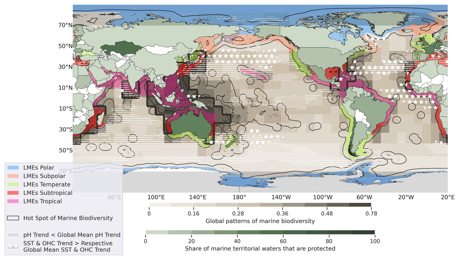 Figure 2Biodiversity of the ocean under rapid changes. Global patterns of marine biodiversity shown in the ocean (brown gradient, product ref. no. 13), with hotspots surrounded by bold dark-brown polygons (product ref. no. 13). Share of marine territorial waters that are protected in 2022 shown on land (green gradient, product ref. no. 14). Large marine ecosystems (LMEs; product ref. no. 15) are shown in colours along the coasts. The boundaries of Areas Beyond National Jurisdiction (ABNJ) are materialized by black lines off the coasts (product ref. no. 16). Stars represent where 95 % of the local sea surface temperature (SST) and ocean heat content (OHC) trend ranges surpass the global average for the period 1982–2024, based on product ref. nos. 2, 4–6, 9–11, and 21. Horizontal hatching is the same but for the pH trend for the period 1985–2022, based on product ref. no. 12. The Caspian Sea is shaded in grey, as data were not available, except for the share of marine territorial waters of the surrounding countries.
