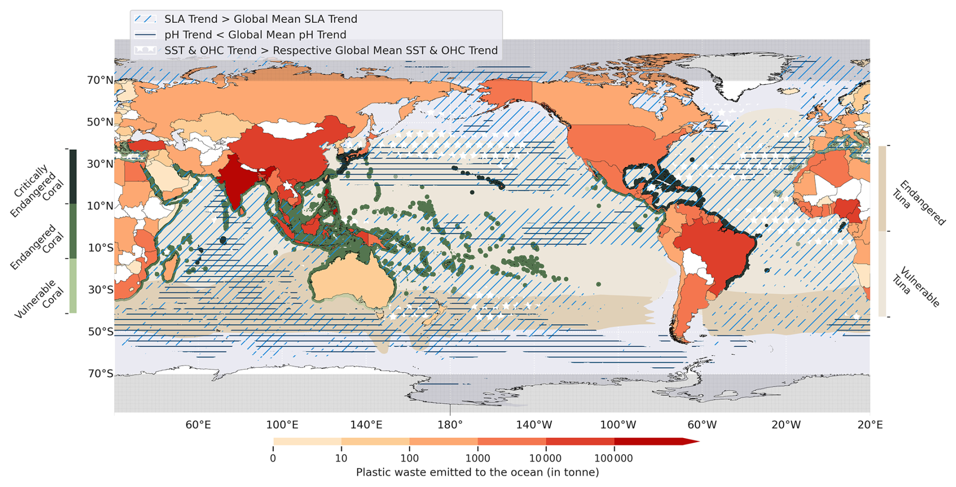 Figure 3Illustration of the triple planetary crisis. Plastic waste emitted into the ocean by each country is shown on land (red gradient, product ref. no. 17). Vulnerable and endangered tuna is shown in oceans (sand–grey gradient, product ref. no. 18). Vulnerable, endangered, and critically endangered coral is shown with a green gradient (product ref. no. 19). Stars represent where the local sea surface temperature (SST) and ocean heat content (OHC) trends surpass the global average for the period 1982–2024, based on product ref. nos. 2, 4–6, 9–11, and 21. Horizontal hatching is the same, but for the pH trend, for the period 1985–2022, based on product ref. no. 12. Oblique hatching shows where the local sea level rise (SLR) trend surpasses the global trend for the period 1999–2024, based on product ref. no. 20.