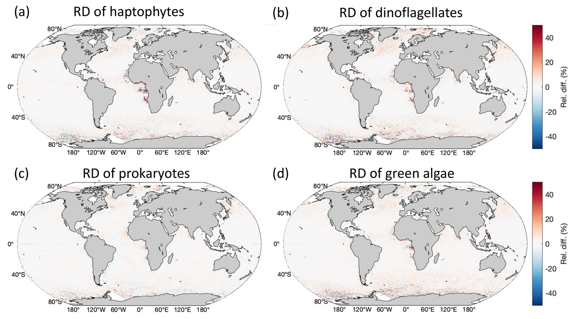 Figure 2Global distribution of the RD between MLBE-corrected OLCI- and merged-sensor-derived PFT Chl a over the 1-year overlapped period (May 2016–April 2017).