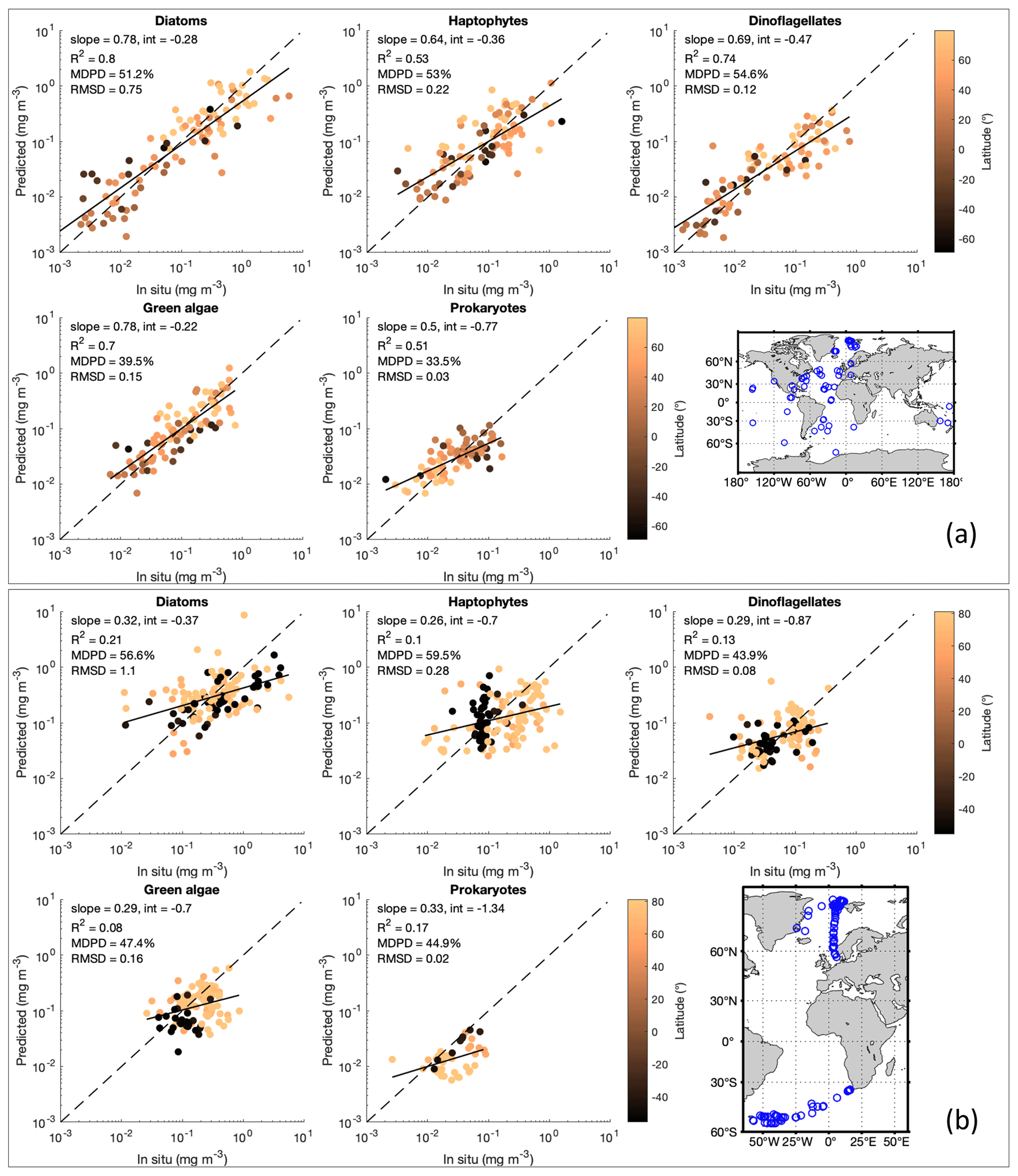Validation of the corrected OLCI-derived PFTs was carried out by applying the 4 km MLBE to the OLCI-derived PFT data that are collocated with the two independent in situ datasets, as described in Sect. 2.3. Scatterplots and statistics of the validation using dataset 1 displayed in Fig. 3a show good agreements between the corrected OLCI PFT data and the in situ data, R2 > 0.51 and MDPD < 56 %, with diatoms showing the best slope (0.78) and correlation coefficient (0.80) and with prokaryotes showing the lowest MDPD (33.5 %). We also provided a similar validation analysis for the OLCI data before the correction (Fig. S1 in the Supplement) to have a direct comparison. The overall validation shows that the MLBE correction on the OLCI-derived PFT data preserves the distribution features from the original OLCI-derived PFT dataset; however, overall, slightly downgraded statistics have been observed for nearly all PFTs, except for the MLBE-corrected haptophytes and prokaryotes, which showed slightly better MDPD against the in situ data compared to the validation of the original OLCI-derived data. The validation using dataset 1 indicates that the MLBE correction does not significantly change the PFT variability, showing its feasibility to generate consistent time series data. On the other hand, validation using dataset 2, which contains recently obtained in situ data at high latitudes only, exhibited larger discrepancies than that from dataset 1 (Fig. 3b). All PFTs showed low correlation between the MLBE-corrected and in situ data, with the highest R2 only 0.21 for diatoms and the lowest R2 for green algae. Though the MDPD values are all below 60 %, the low R2 indicates weak agreements between the corrected and in situ data. Prokaryotes show underestimations in the corrected OLCI data compared to the in situ data, mostly for the Arctic data. A similar validation for the original OLCI-derived PFTs using dataset 2 has also been provided in Fig. S2 in the Supplement, showing overall almost equivalent statistics with the validation of the corrected data, with a slightly higher R2 of 0.24 for diatoms and the lowest R2 for green algae (0.09). This confirms that PFT data at high latitudes bear large uncertainties, which is in line with the per-pixel uncertainty estimated by considering errors induced by the input satellite data and the EOF-PFT algorithm parameters (Xi et al., 2021). The satellite PFTs were not improved even with the MLBE correction, suggesting that the inherent high uncertainties in high latitudes are mostly attributed to the retrieval models that are not efficient enough in these regions. Therefore, PFT observations in the high latitudes need more attention in terms of improved estimation methods and higher data quality.