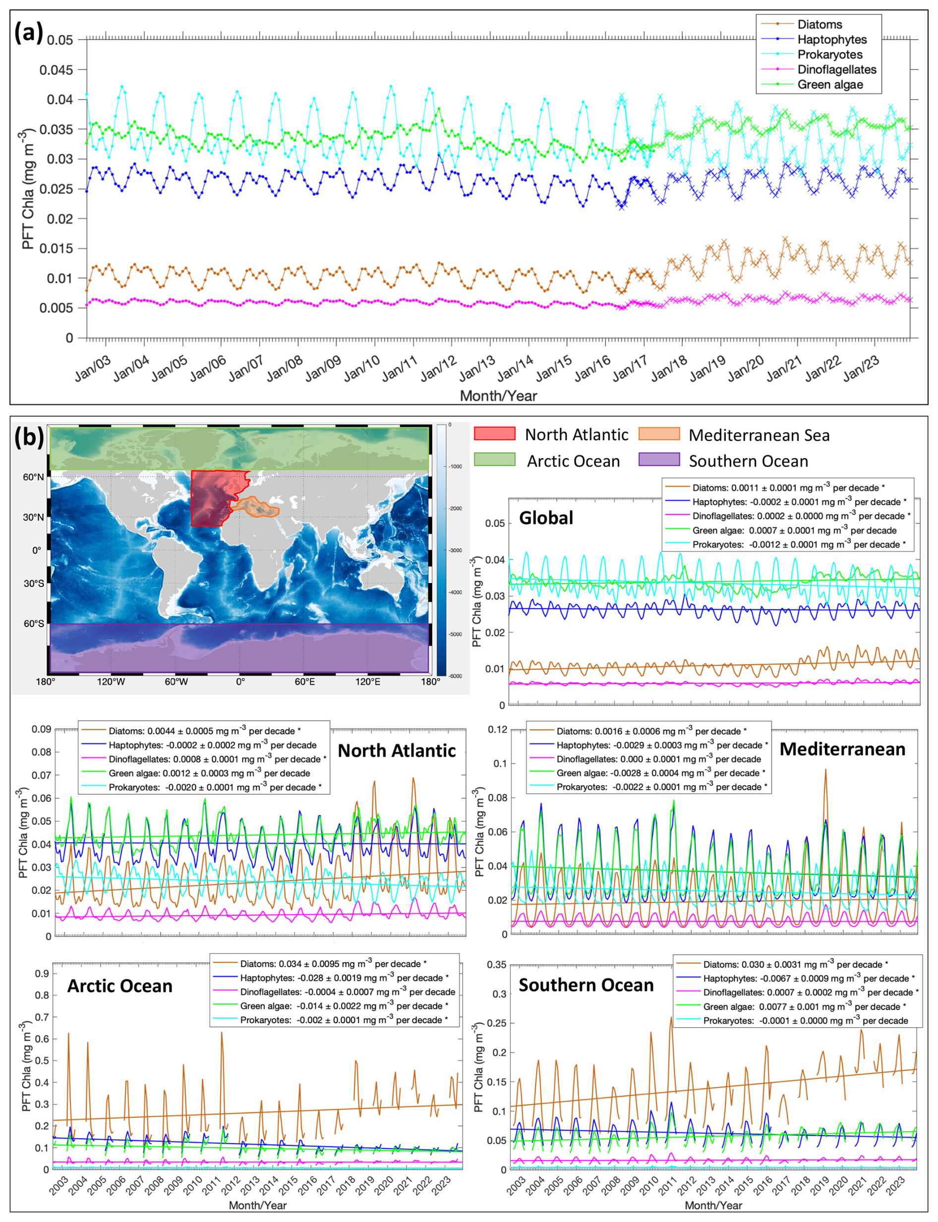 Figure 4(a) Updated (corrected) time series of the five PFT Chl a based on the global mean from 2002 to 2023. Merged-sensor-derived PFT products cover the period of July 2002–April 2017 (indicated with dots), and OLCI-derived PFT products are for May 2016–December 2023 (indicated with crosses). Note that the OLCI-derived products are corrected to merged products based on MLBE. (b) Trends in the Chl a of diatoms, haptophytes, dinoflagellates, green algae, and prokaryotes on the global scale and on four regional scales (the North Atlantic Ocean, the Mediterranean Sea, the Arctic Ocean, and the Southern Ocean). Trend slopes per decade with uncertainties are indicated, with significant trends marked with an asterisk (*).