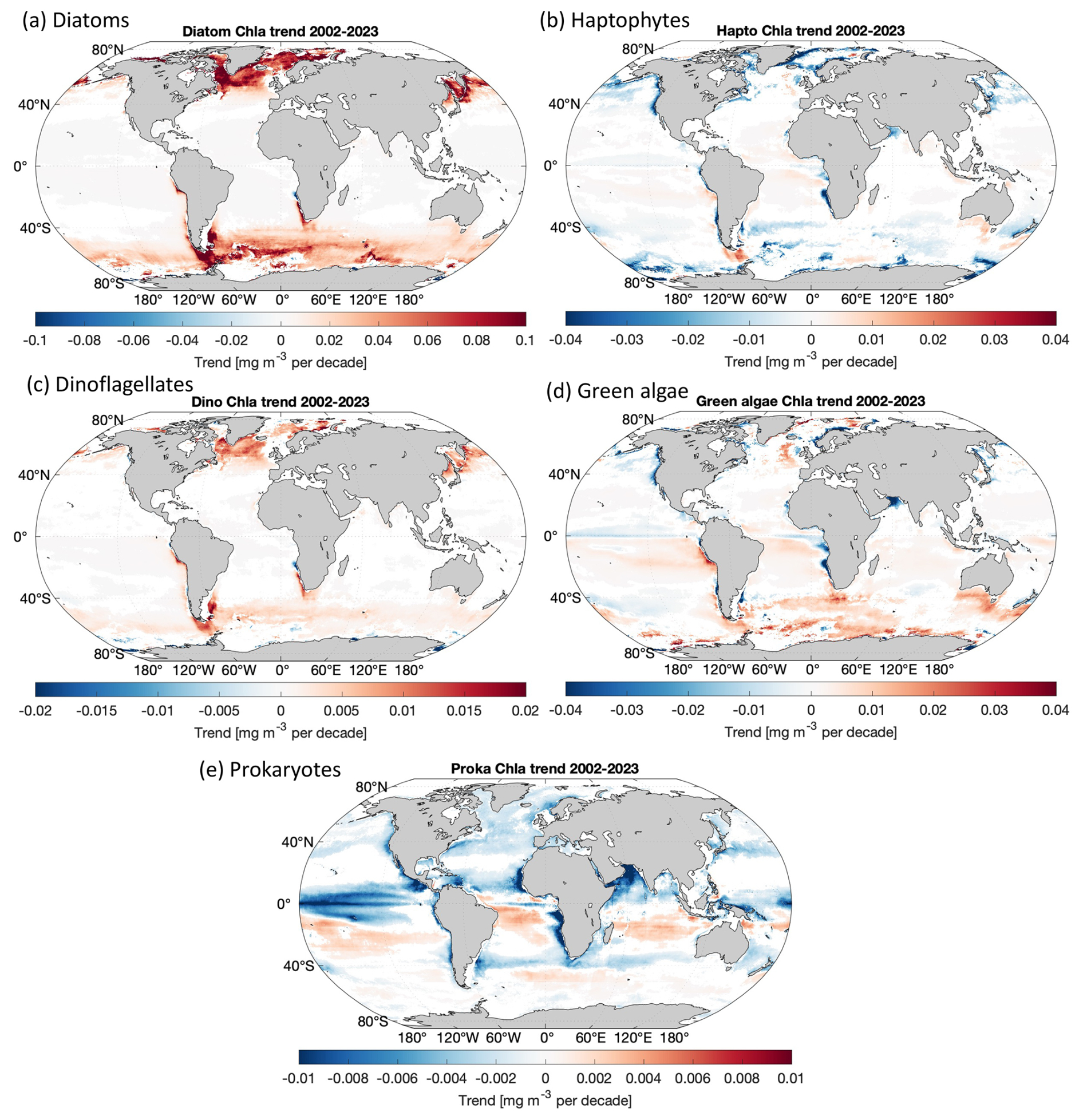 Figure 5Per-pixel trends for Chl a of (a) diatoms, (b) haptophytes, (c) dinoflagellates, (d) green algae, and (e) prokaryotes (only where p < 0.05 is shown; slope unit: mg m−3 per decade).