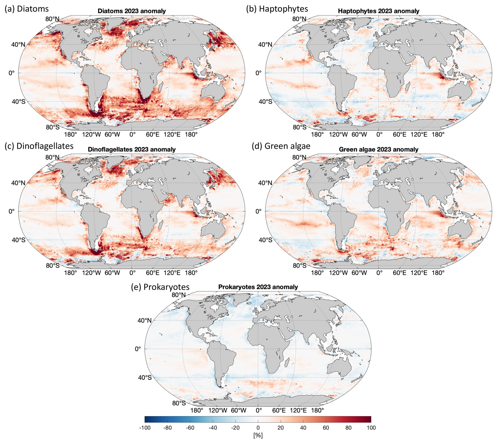 Figure 6 shows the relative anomalies (%) of the five PFTs in 2023 compared to the average PFT state over the 20 years. The diatom anomaly presents higher Chl a for most of the global ocean, with a dramatic increase in latitudes > 40°. This can already be expected from the time series in Fig. 4a, where diatoms show elevated Chl a from autumn 2017 and keep a similarly high biomass in 2023. The global mean of the diatom in 2023 is about 24 % higher than the 2-decade average, and the anomaly varies from −30 % to 110 %, with extremely high values in the Arctic Ocean and the coastal regions in the southern part of South America. Dinoflagellates show a similar anomaly, with diatoms in a much milder pattern, which has a global mean of about 9.4 %. The haptophyte anomaly presents changes without a clear pattern, showing slight increases in Chl a in the Pacific gyres, the eastern Indian Ocean, and the Southern Ocean but slight decreases in the temperate latitudes. The overall global mean anomaly of haptophyte Chl a is only very slightly higher compared to the 2-decade average (1.6 %). Green algae show a similar distribution in biomass change to haptophytes but a slightly more prominent increase in most of the global oceans (global mean of 6.5 %). Prokaryotes generally show decreased Chl a in 2023 (global mean of −2.1 %), with only slight increases observed in the South Pacific Ocean and part of the Southern Ocean.