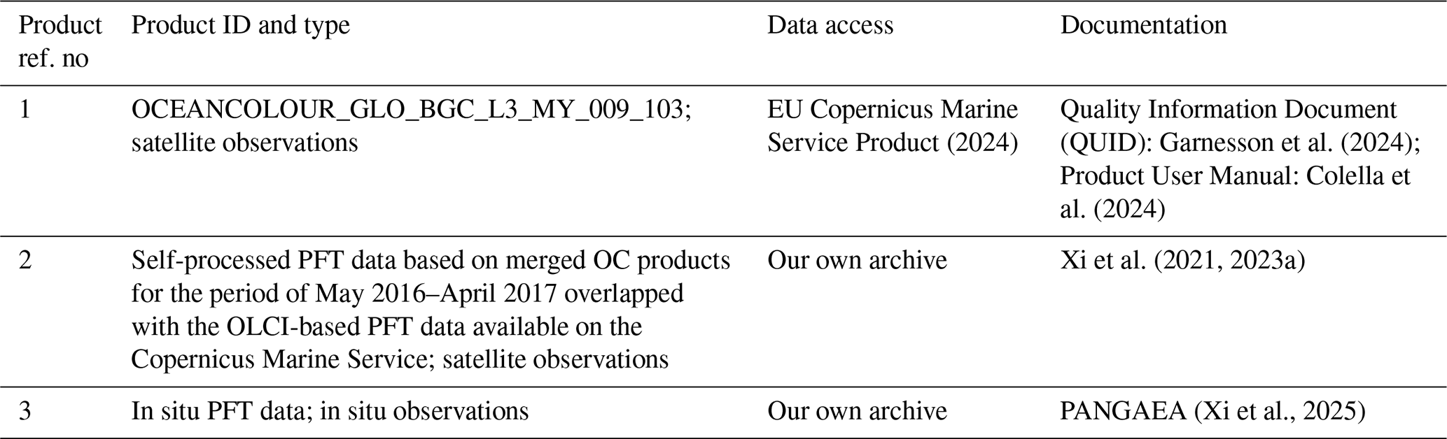 Data and products used in this study and their availabilities and supporting documentation are listed in Table 1, from which the in situ HPLC pigment concentrations and the corresponding derived in situ PFT Chl a data used for validation are published on PANGAEA (https://doi.org/10.1594/PANGAEA.982433; Xi et al., 2025).